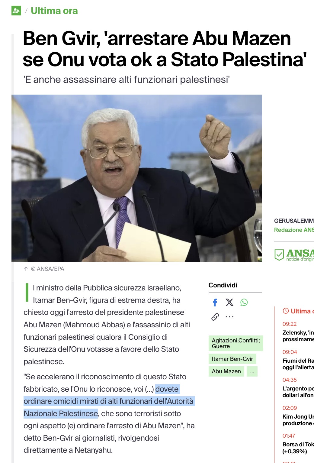 “Se accelerano il riconoscimento di questo Stato fabbricato, se l’Onu lo riconosce, voi (…) dovete ordinare omicidi mirati di alti funzionari dell’Autorità Nazionale Palestinese, che sono terroristi sotto ogni aspetto (e) ordinare l’arresto di Abu Mazen”, ha detto Ben-Gvir ai giornalisti, rivolgendosi direttamente a Netanyahu.