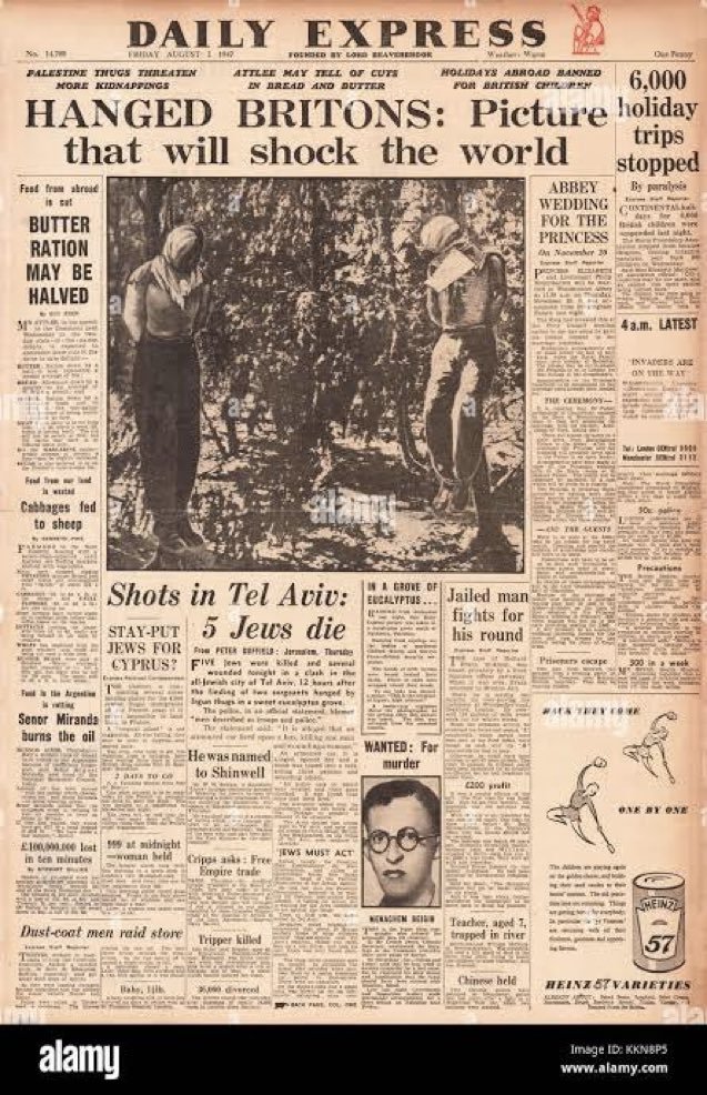 29/07/1947: il cosiddetto “Affare dei sergenti”: L’Irgun rapì due sottufficiali del British Army Intelligence Corps e, in risposta alle condanne a morte pronunciate contro tre combattenti dell’Irgun, li impiccò e ne mise i bottini di furti sui corpi. La furia per questo portò a rivolte antiebraiche in Gran Bretagna.