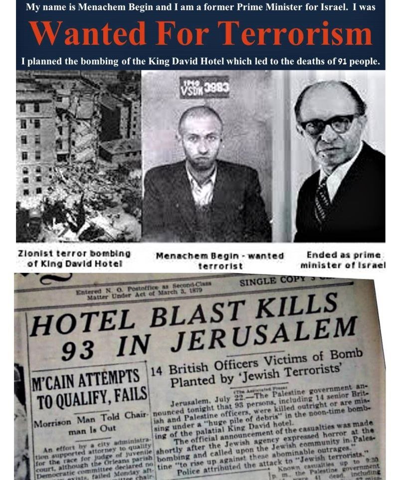 22/07/1946: l’Irgun di Begin effettuò l’attentato al King David Hotel di Gerusalemme, provocando la morte di 91 persone e il ferimento di altre 46. Tra le vittime il personale dell’hotel e passanti innocenti. Nel 2006, Israele ha inaugurato una targa per celebrare i responsabili dell’attentato.